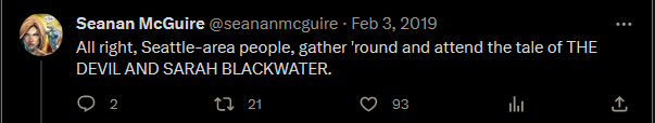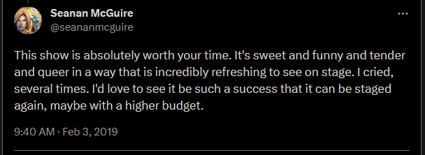 The Devil and Sarah Blackwater premiered at Annex Theatre in February 2019, co-directed by Madison Jade Jones and Sam Ro. It received the People’s Choice for Best New Play at the 2019 Gregory Awards.